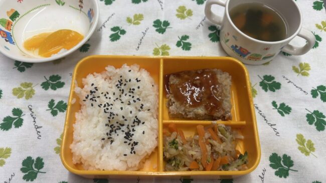 4月3日(木) 給食ブログBy ニコニコ保育2025年5月1日【お給食】 ・ハンバーグ ・ブロッコリーのツナ和え ・コンソメスープ(ほうれん草、人参、しめじ) ・ごはん ・もも 【おやつ】 ・お花クッキー ・牛乳 今日はお花見献立でした。お花の形のクッキ…