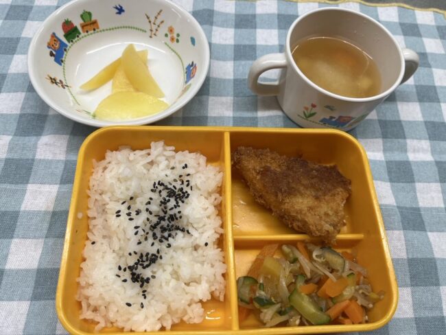 7月14日(月) 給食ブログBy ニコニコ保育2025年8月5日【お給食】 ・白身フライ ・三色和え ・味噌汁(厚揚げ、人参、えのき) ・ごはん ・りんご 【おやつ】 ・カレーチャーハン ・牛乳 今日はお魚のフライでした!とても人気でみんなあっという間に食…