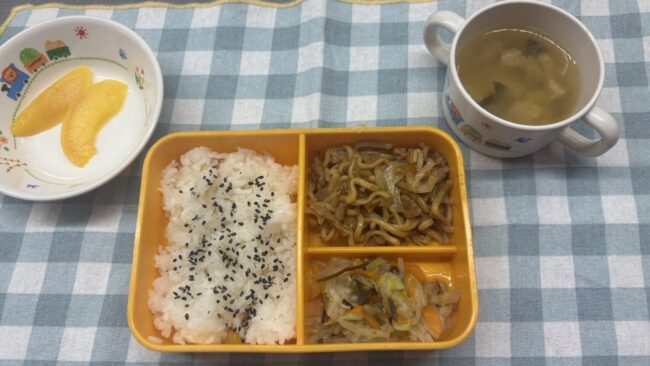 7月25日(金) 給食ブログBy ニコニコ保育2025年8月5日【お給食】 ・焼きそば ・白菜の塩昆布和え ・味噌汁(わかめ、油揚げ、大根) ・ごはん ・もも 【おやつ】 ・誕生日ケーキ ・カルピス 今日はお誕生日会でした!!上手にお歌を歌ってみんなでお祝…
