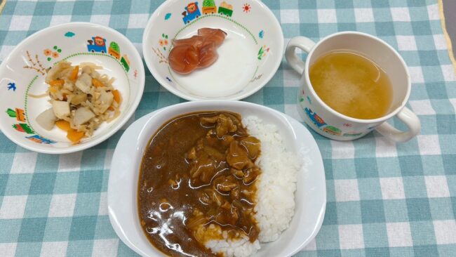 7月28日(月) 給食ブログBy ニコニコ保育2025年8月5日【お給食】 ・ハヤシライス ・切干大根煮 ・味噌汁(玉ねぎ、ほうれん草、もやし) ・ゼリー 【おやつ】 ・いちごチュロス ・牛乳 今日は初めてイチゴ味のチュロスを出してみました! 「いちごのに…
