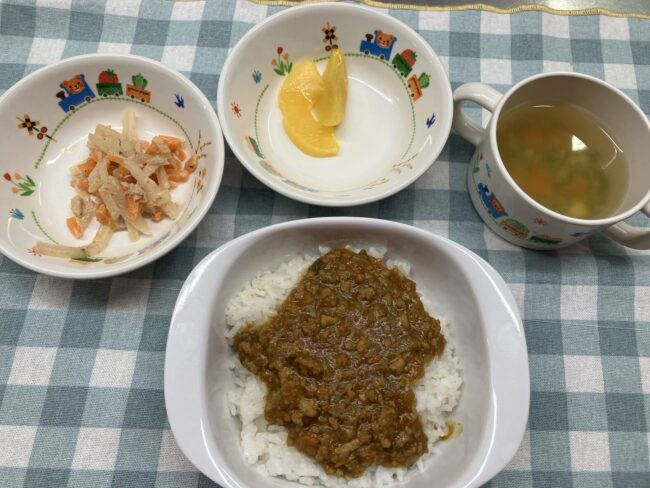 10月31日(金) 給食ブログBy ニコニコ保育2025年11月25日【お給食】 ・キーマカレー ・ツナマヨ大根 ・コンソメスープ(人参、コーン、ブロッコリー) ・もも 【おやつ】 ・かぼちゃクッキー ・牛乳 ハッピーハロウィン~! 今日はハロウィンという事でか…