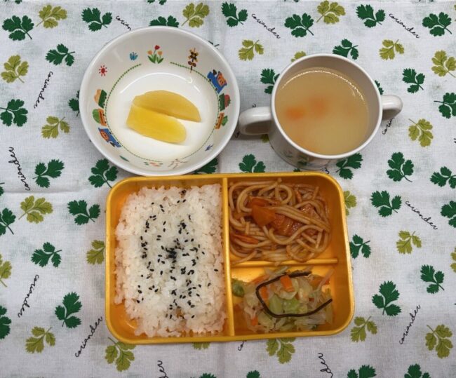 3月10日(火) 給食ブログBy ニコニコ保育2026年4月7日【お給食】 ・ナポリタンパスタ ・キャベツの塩昆布和え ・コンソメスープ(人参、玉ねぎ、春雨) ・ごはん ・もも 【おやつ】 ・マシュマロコーンフレーク ・牛乳 今日はおやつにマシュマロコーン…
