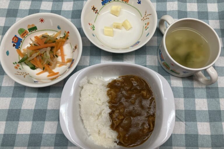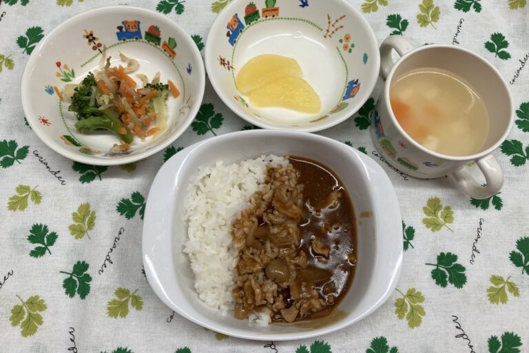 【お給食】 ・カレーライス ・もやしの中華和え ・コンソメスープ(ブロッコリー、コーン、春雨) ・チーズ 【おやつ」 ・お花クッキー ・牛乳 ご進級おめでとうございます! 今日はお花見にいき、…